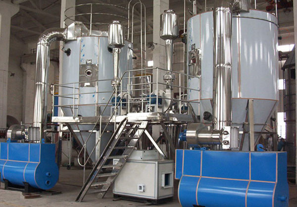 空氣經過濾和加熱,進入干燥器頂部空氣分配器,熱空氣呈螺旋狀均勻地進入干燥室。料液經塔體頂部的高速離心霧化器,(旋轉)噴霧成極細微的霧狀液珠,與熱空氣并流接觸在極短的時間內可干燥為成品。成品連續地由干燥塔底部和旋風分離器中輸出,廢氣由風機排空。