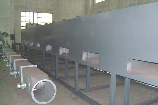 物料由加料器均勻地鋪在網帶上,網帶一般采用12-60目不銹鋼絲網,由傳動裝置拖動在干燥機內移動。干燥機由若干單元組成,每一單元熱風獨立循環,部分尾氣由專門排濕風機排出,廢氣由調節閥控制,熱氣由下往上或由上往下穿過鋪滿物料的網帶完成熱量與質量傳遞的進程,帶走物料水份。網帶緩慢移動,運行速度可根據物料溫度自由調節,干燥后的成品連續落入收料器中。上下循環單元根據用戶需要可靈活配備,單元數量亦可根據需要選取。